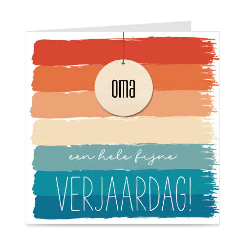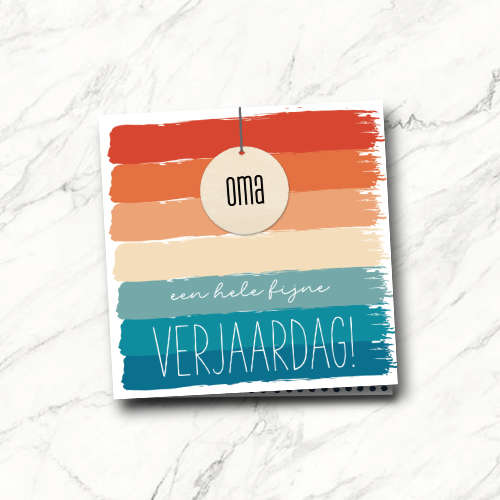 Leuke verjaardagskaart met vrolijke kleuren en een houten hanger van 40 mm, waarop ‘OMA’ staat gebrand!