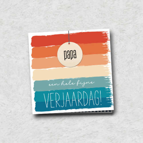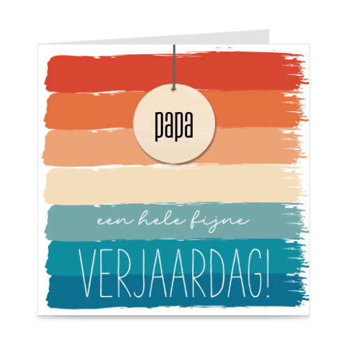 Leuke verjaardagskaart met vrolijke kleuren en een houten hanger van 40 mm, waarop ‘PAPA’ staat gebrand!