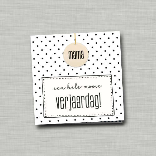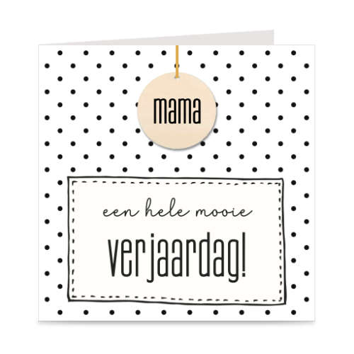 Leuke verjaardagskaart in zwart & wit met een houten hanger van 40 mm, waarop ‘MAMA’ staat gebrand!