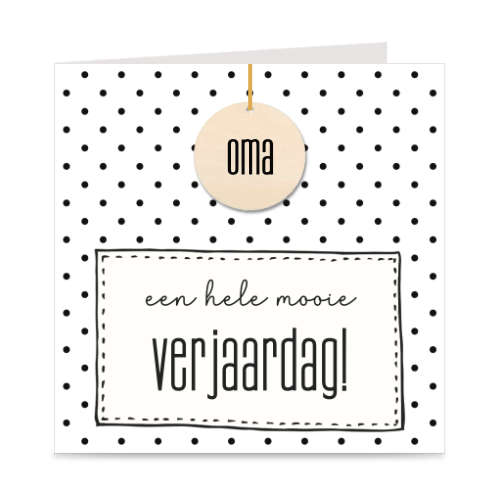 Leuke verjaardagskaart in zwart & wit met een houten hanger van 40 mm, waarop ‘OMA’ staat gebrand!